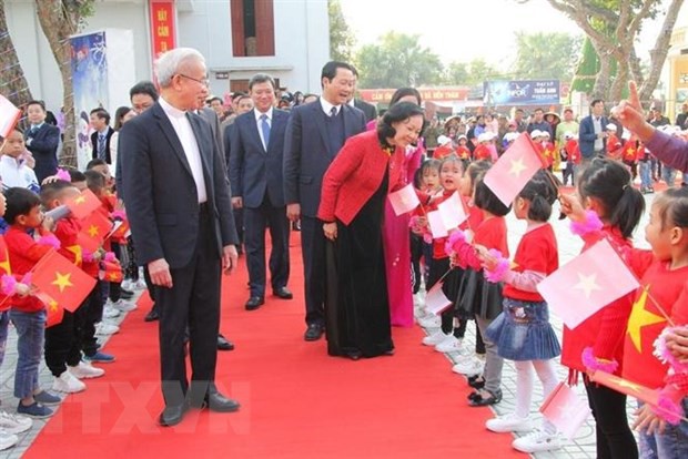 Bà Trương Thị Mai, Ủy viên Bộ Chính trị, Bí thư Trung ương Đảng, Trưởng ban Dân vận Trung ương và đoàn công tác đến thăm, chúc mừng Giáo xứ Phúc Lãng, xã Quảng Trường, huyện Quảng Xương. - Ảnh: Trịnh Duy Hưng/TTXVN |