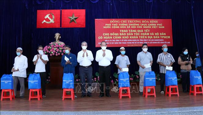 Phó Thủ tướng Thường trực Trương Hòa Bình (thứ 5 từ trái sang) tặng quà Tết đồng bào Chăm tại Thành phố Hồ Chí Minh - Ảnh: TTXVN |