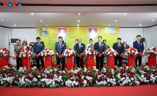 Các đại biểu cắt băng khánh thành công trình dự án “Đầu tư đổi mới thiết bị công nghệ tại Đài Phát thanh Quốc gia Lào”. Ảnh: PV/VOV-Vientiane |