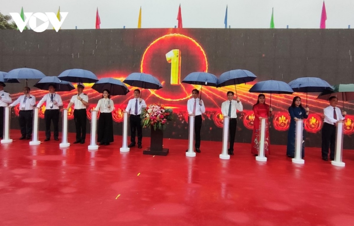 Các đại biểu hai địa phương Quảng Ninh - Quảng Tây ấn nút chính thức mở cửa khẩu cặp cửa khẩu song phương Hoành Mô (Việt Nam) – Động Trung (Trung Quốc). Ảnh: Vũ Miền/VOV |