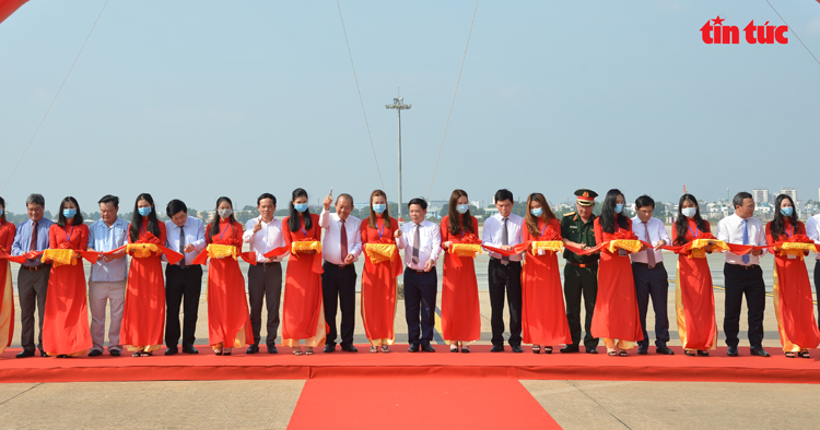 Các đại biểu cắt băng khánh thành giai đoạn 1 Dự án nâng cấp, cải tạo đường cất hạ cánh, đường lăn Cảng hàng không quốc tế Tân Sơn Nhất. - Ảnh: tintuc.vn |