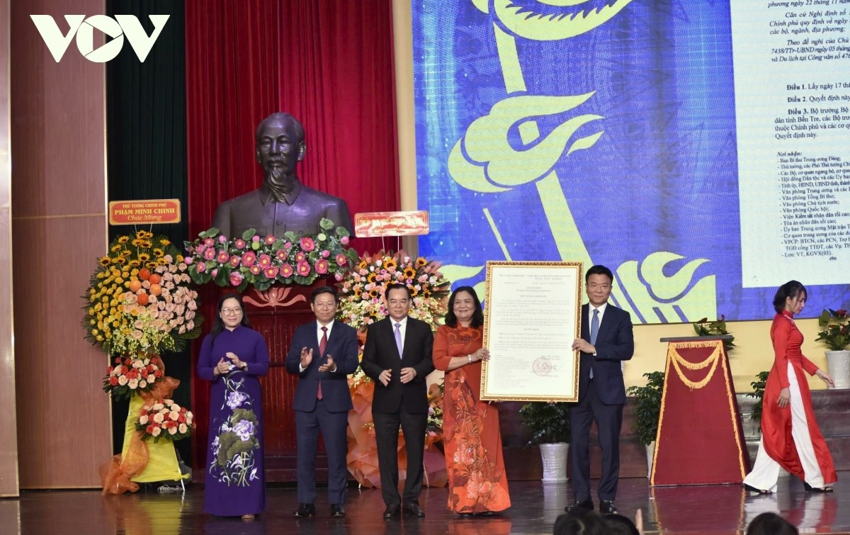 Phó Thủ tướng Chính phủ Lê Thành Long trao bảng công nhận Ngày truyền thống tỉnh Bến Tre 17/1. Ảnh: Nhật Trường/VOV |