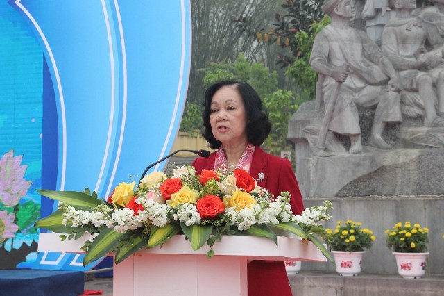 Ủy viên Bộ Chính trị, Trưởng Ban Dân vận Trung ương Trương Thị Mai phát biểu tại Lễ kỷ niệm 70 năm Bác Hồ tặng thơ Thanh niên Xung phong (28/3/1951-28/3/2021). Nguồn: vov.vn |