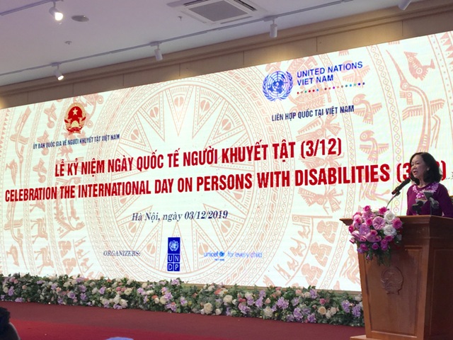 Chiều 3/12, tại Hà Nội, Ủy ban Quốc gia về Người Khuyết tật Việt Nam phối hợp với cơ quan của Liên hợp quốc tại Việt Nam tổ chức Lễ kỷ niệm ngày quốc tế người khuyết tật (3/12).