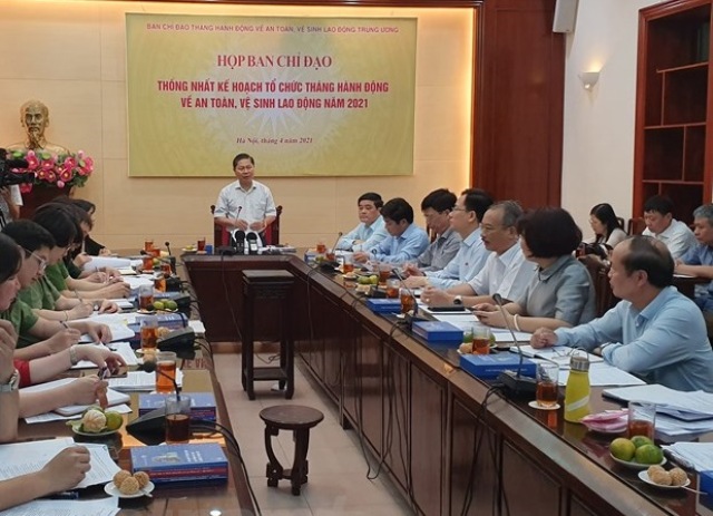 Đại diện các bộ, ngành họp bàn triển khai Tháng hành động về an toàn vệ sinh lao động và Tháng Công nhân năm 2021 vào sáng 13/4. Ảnh: baodantoc.vn |