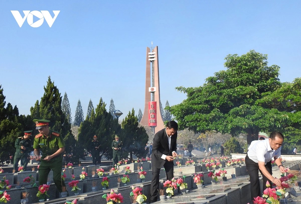 Thắp hương trên các phần mộ liệt sỹ trong Nghĩa trang liệt sỹ tỉnh Kon Tum. Ảnh: VOV |