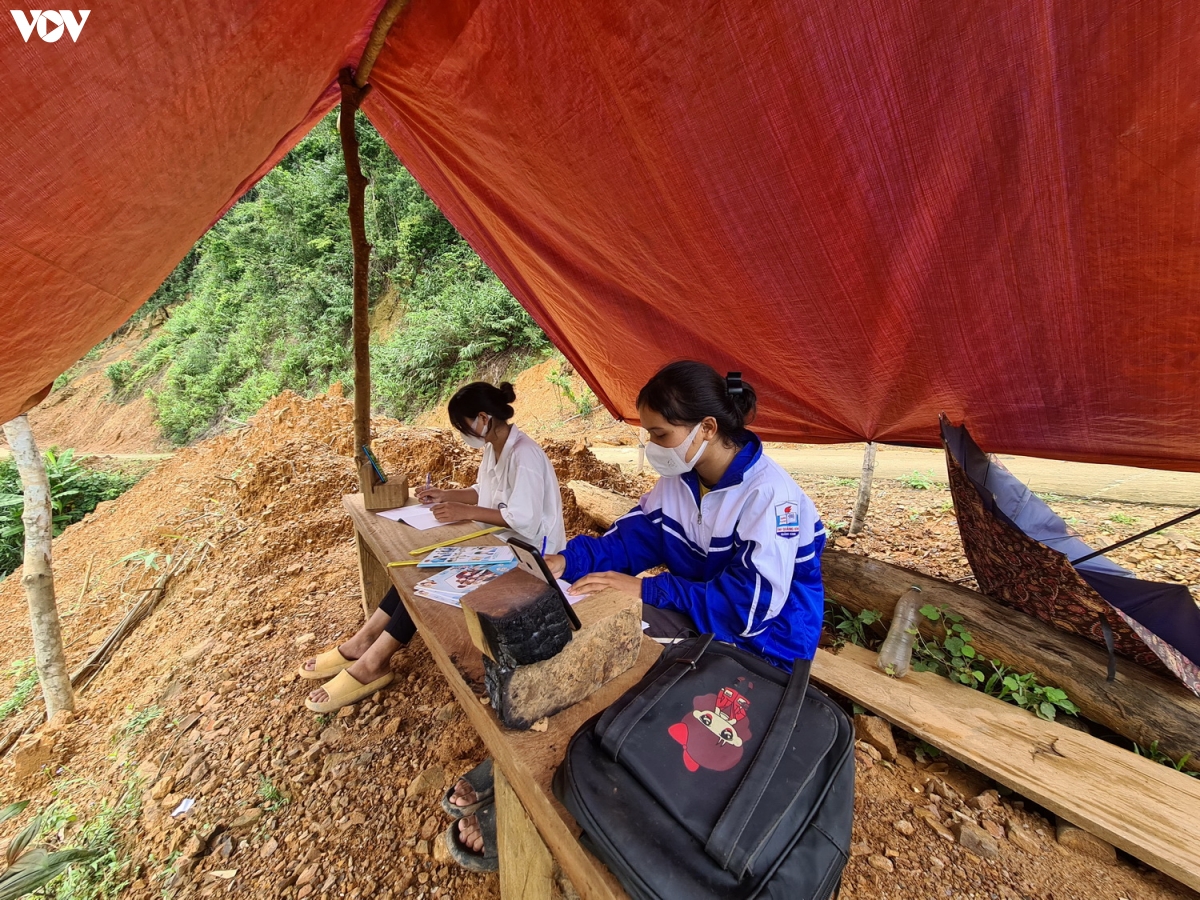 Thỉnh thoảng thầy cô giáo ở ngoài trung tâm xã đi vào bản thăm học sinh, ngang qua chỗ lều dựng tạm đều dừng lại tặng các em sách, vở. Nhờ chiếc lều ở đây mà những tháng qua, Hồ Thị Son và em gái không bị bỏ lỡ buổi học nào dù đã tạm ngưng đến trường: “Vấn đề lo nhất của em là sợ không theo học kịp các bạn, các bạn học ở ngoài kia thì có mạng internet, còn em ở trong này lúc có mạng lúc mất sóng, buổi tối không có điện để học. Nếu trời mưa thì em không đi học được, sợ sạt lở, sập núi sập đường nên em xin cô nghỉ. Ba mẹ cho em lên chỗ lều để học, thấy cô cung cấp nhiều kiến thức như em đang đi học ở trường vậy.”