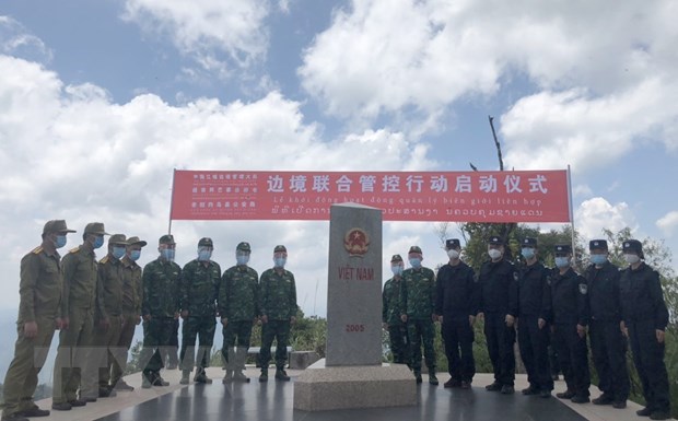 Lực lượng bảo vệ biên giới ba bên Việt Nam-Trung Quốc-Lào gặp gỡ trên thực địa tại mốc số 0 khu vực Ngã ba biên giới. Ảnh: TTXVN |