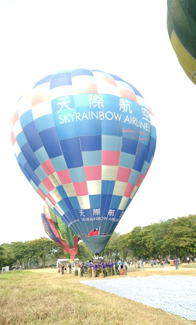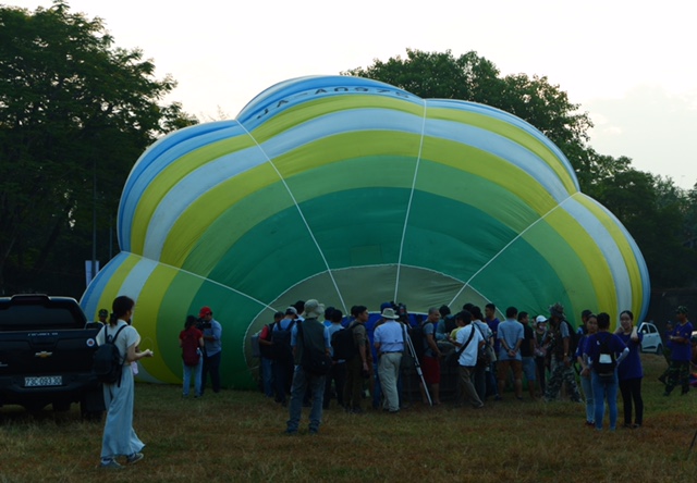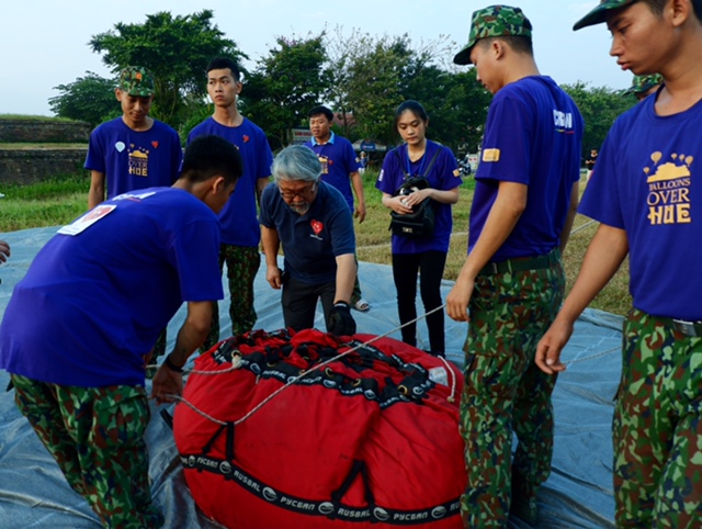 Phi hành đoàn tiến hành trải vỏ bóng ra sân. Tiếp đó, họ dùng một chiếc quạt có công suất lớn thổi không khí vào miệng khinh khí cầu.