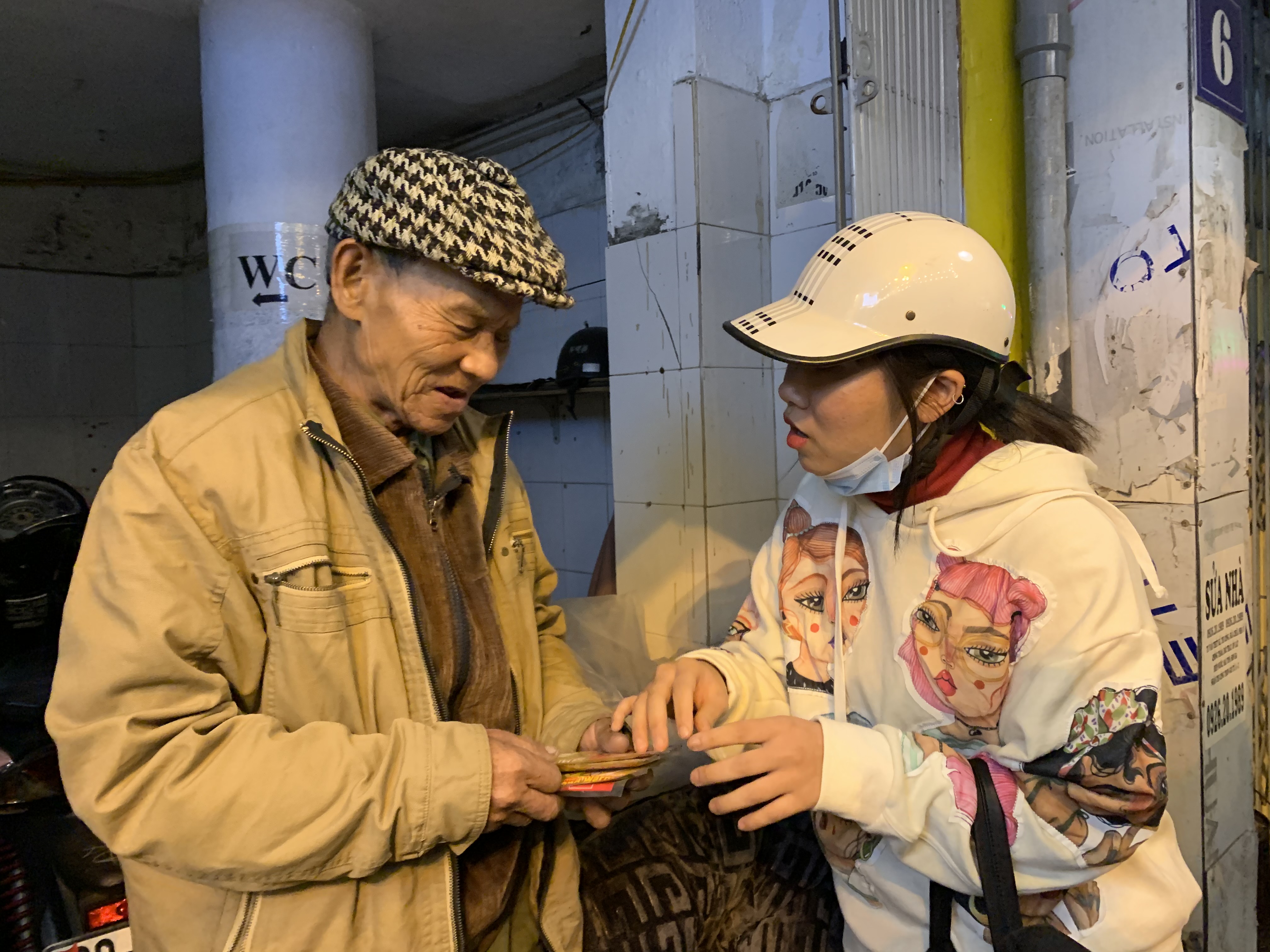 Tới góc phố Lê Duẩn, Nhóm từ thiện trao gói quà cho ông Nguyễn Văn Thịnh, hơn 70 tuổi, quê ở Phủ Lý, tỉnh Hà Nam. Lên Hà Nội đã được 6 năm, hàng ngày, ông Thịnh đi xin chai nhựa, giấy bìa sống, tối đến mượn vỉa hè làm nơi qua đêm. “Tôi ở nhờ cửa hàng này, họ đóng cửa dọn hàng là tôi trải chăn ra nằm. Tôi cũng không thấy lạnh đâu, có cái chăn này còn đang muốn cắt bớt đi, tôi không sợ rét. Sức khỏe thì lúc nào cũng phải lo nhưng mà giữ gìn được thì càng tốt. Con cháu có nhưng chúng nó nghèo không nuôi được tôi. Từ ngày bà nhà tôi mất, tôi chán, cứ yếu dần chống gậy không nổi, tôi theo mọi người lên Hà Nội thấy khỏe ra, Tết tư tôi mới về thôi”