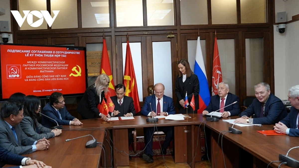 Lễ ký thoả thuận hợp tác giữa Đảng Cộng sản Việt Nam và Đảng Cộng sản Liên bang Nga. Ảnh: VOV |