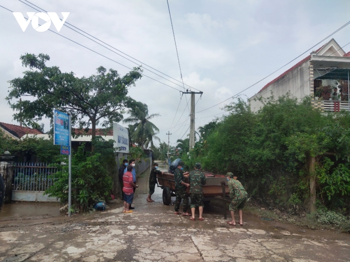 Tại huyện Tuy Phước vẫn còn ngập sâu. Địa phương huy động hàng trăm cán bộ, chiến sĩ bộ đội, công an, dân quân khắc phục hư hỏng nhà cửa cho người dân bị ảnh hưởng mưa lũ, nhanh chóng giúp người dân sớm ổn định cuộc sống.
