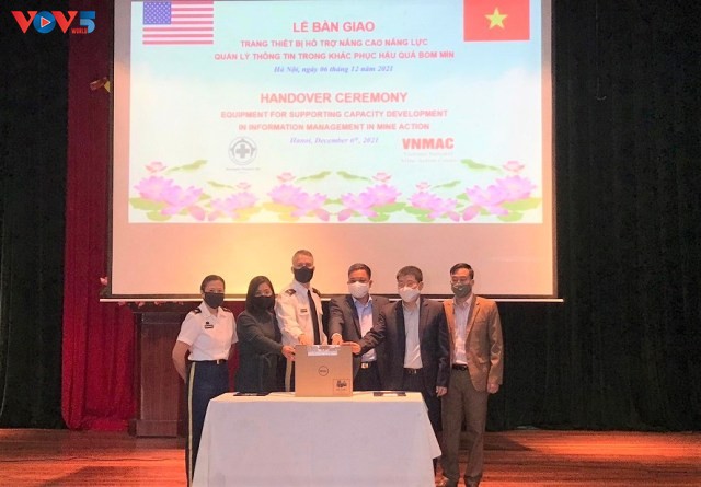 Đại sứ quán Hoa Kỳ trao tặng các trang thiết bị phục vụ việc quản lý thông tin trong khắc phục hậu quả bom mìn sau chiến tranh. Ảnh: Vĩnh Phong/VOV5 |
