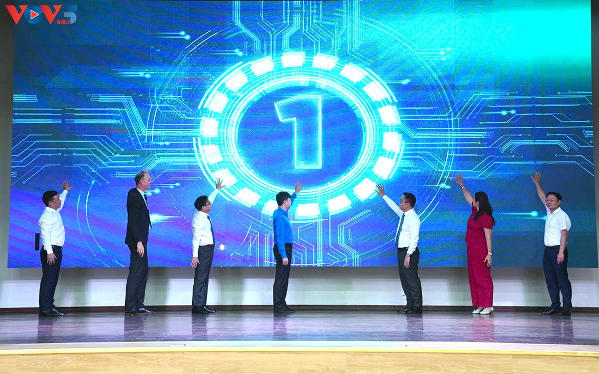 Các đại biểu chính thức khởi động Cuộc thi “Thách thức đổi mới sáng tạo thời đại số - Youth Digital Innovation Challenge” với chủ đề “Thu hẹp khoảng cách số”. Ảnh: Kim Thanh/VOV |