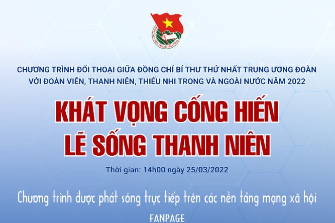 Ngày 25/3 tới, Bí thư thứ Nhất Trung ương Đoàn Nguyễn Anh Tuấn sẽ có buổi đối thoại với đoàn viên, thanh niên, thiếu nhi trong và ngoài nước năm 2022 với chủ đề “Khát vọng cống hiến - Lẽ sống thanh niên”. Chương trình được phát sóng trực tiếp từ điểm cầu trung tâm Trụ sở Trung ương Đoàn và kết nối trực tuyến đến 63 tỉnh, thành Đoàn cùng 21 tổ chức Đoàn, Hội ở ngoài nước.