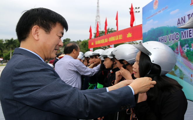 Lãnh đạo tỉnh trao mũ bảo hiểm đạt chuẩn cho các em học sinh của tỉnh Yên Bái tham gia Ngày hội. - Ảnh: Báo Yên Bái |
