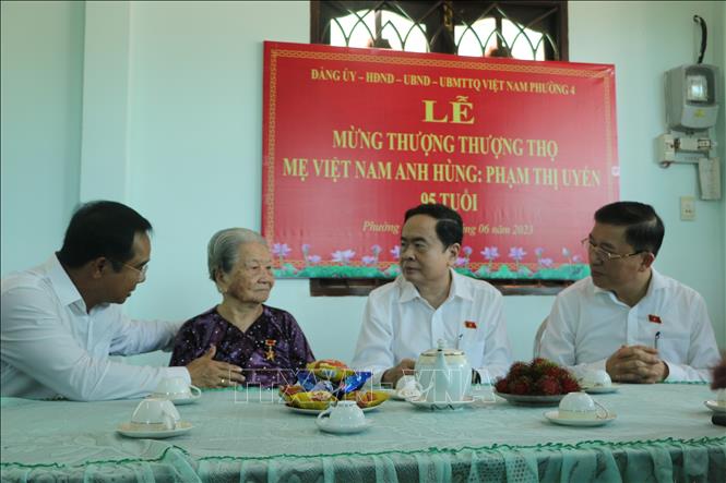 Phó Chủ tịch Thường trực Quốc hội Trần Thanh Mẫn và Bí thư Tỉnh ủy Long An Nguyễn Văn Được thăm mẹ VNAH Phạm Thị Uyển, ngụ phường 4, thành phố Tân An. Ảnh: TTXVN |