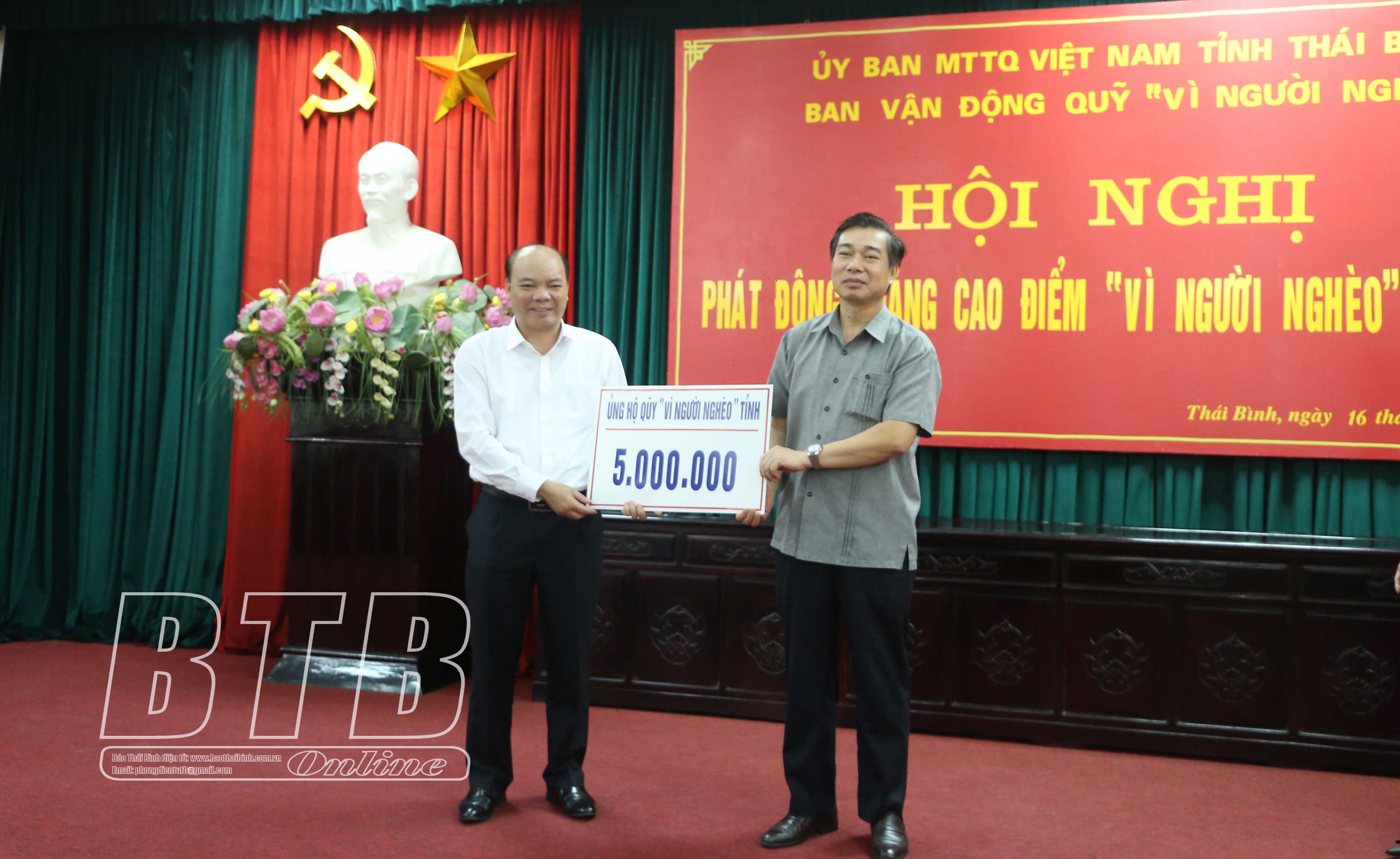 Ông Đặng Thanh Giang, Ủy viên Ban Thường vụ, Trưởng ban Dân vận Tỉnh ủy Thái Bình thay mặt cơ quan Ban Dân vận Tỉnh ủy ủng hộ Quỹ “Vì người nghèo” tại Hội nghị phát động Tháng cao điểm “Vì người nghèo” năm 2020. Ảnh: Tiến Đạt |