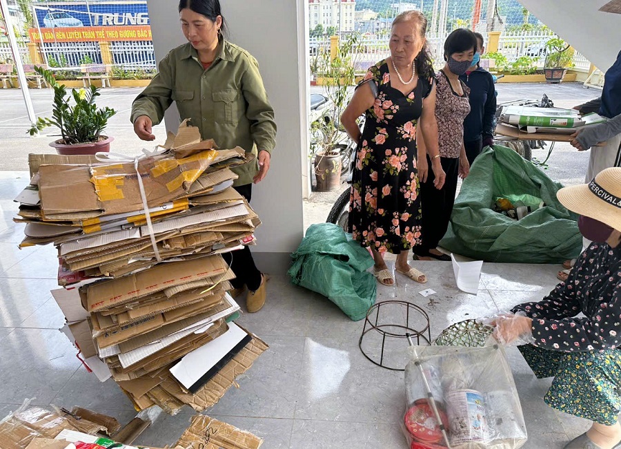 Hàng tháng chị em phụ nữ tổ chức phân loại rác thải nhựa, bán phế liệu gây quỹ từ thiện. Ảnh: Bích Thủy/VOV |