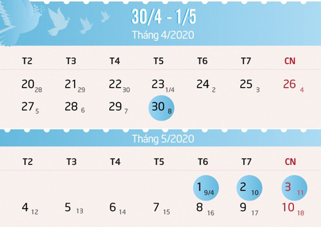 Ngày Tết Độc lập 30/4 và ngày Quốc tế lao động 1/5 rơi vào thứ năm, thứ sáu nên người lao động sẽ nghỉ hai ngày này, cộng với hai ngày cuối tuần 2-3/5. Theo Bộ Lao động Thương binh và Xã hội, đối với các cơ quan, đơn vị không nghỉ cố định thứ bảy và chủ nhật hàng tuần thì sẽ căn cứ vào chương trình, kế hoạch cụ thể để bố trí lịch nghỉ phù hợp, đảm bảo đúng quy định.