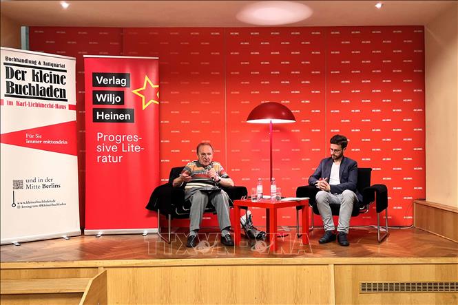 Tác giả, nhà báo người Đức Hellmut Kapfenberger (trái) nói chuyện tại buổi ra mắt sách. Ảnh: Mạnh Hùng/Pv TTXVN tại Đức |