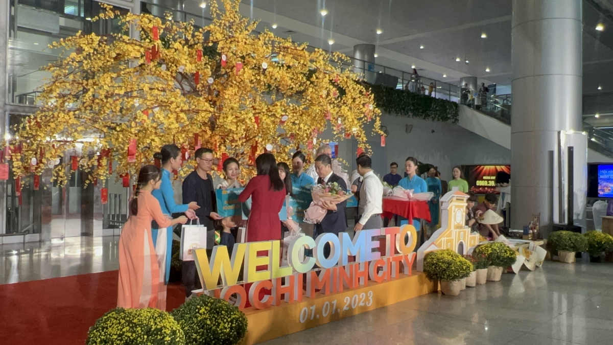 Sáng 1/1, tại Sân bay Quốc tế Tân Sơn Nhất, Sở Du lịch phối hợp với Hãng hàng không Quốc gia Việt Nam và Cảng Hàng không quốc tế Tân Sơn Nhất tổ chức "Lễ đón đoàn khách du lịch đến TP.HCM đầu năm 2023".