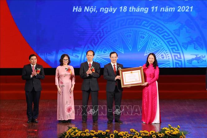 Phó Chủ tịch nước Võ Thị Ánh Xuân trao Huân chương Lao động hạng Nhất cho Tổng cục Giáo dục nghề nghiệp. Ảnh: Hoàng Hiếu/TTXVN |