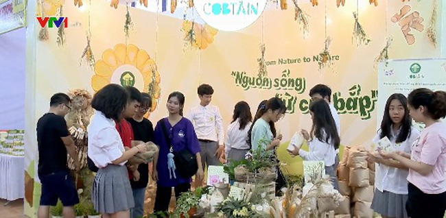 Dự án "Nguồn sống từ cùi bắp" của một nhóm học sinh trung học tại Hà Nội được giới thiệu tại sự kiện nông sản an toàn thực phẩm - Ảnh:vtv.vn |