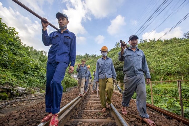 Những công nhân đảm trách công việc tuần đường và sửa chữa đường ray trên tuyến đường đèo Hải Vân |