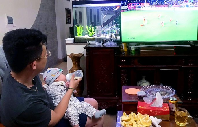 Ông bố 'bỉm sữa' xem bóng đá nhưng cũng không quên nhiệm vụ. (Ảnh: FB)