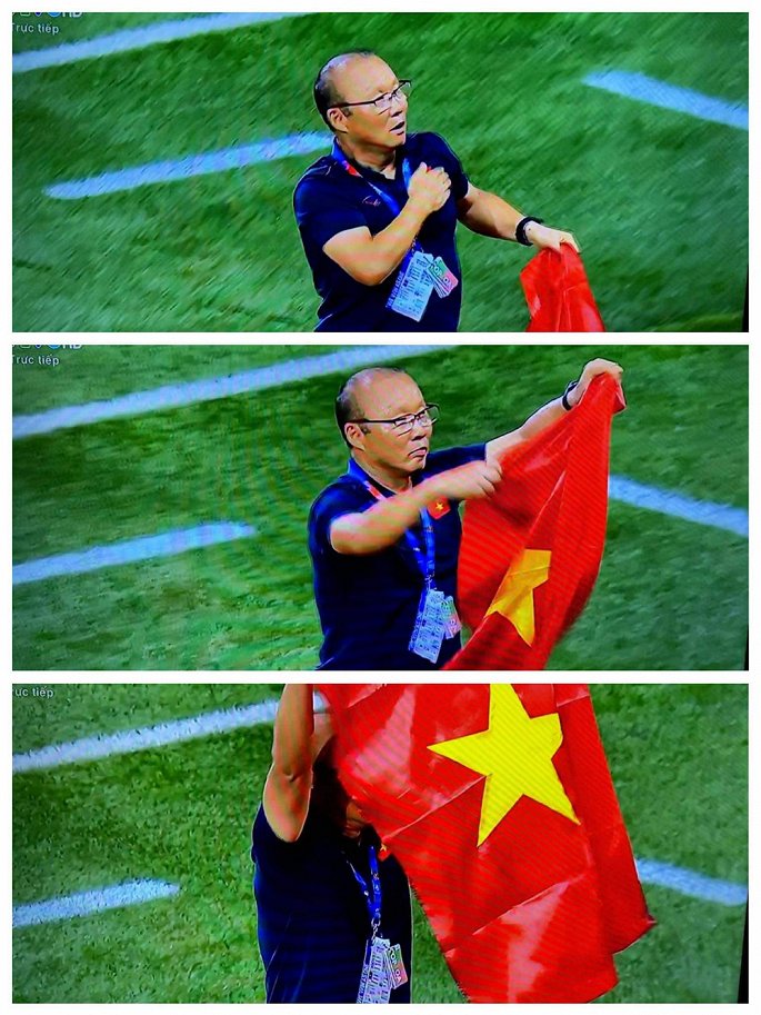 HLV Park Hang-seo đặt tay lên ngực và giơ cao lá cờ Việt Nam như một lời cảm ơn gửi tới người hâm mộ cũng là hình ảnh được cộng đồng mạng chia sẻ rất nhiều.