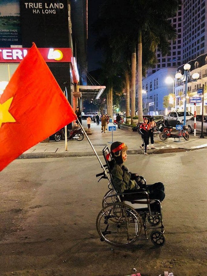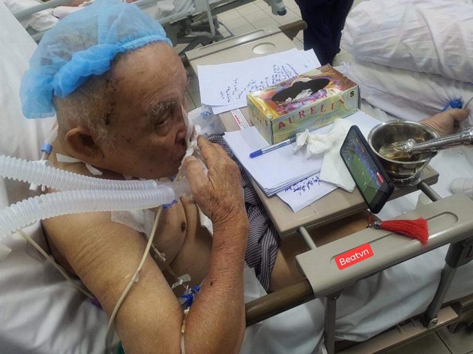 Cụ ông gần 80 tuổi mới phẫu thuật vì xuất huyết não, vẫn còn đang phải thở máy nhưng nhất quyết ngồi dậy xem và cổ vụ cho thầy trò HLV Park Hang-seo khiến nhiều người cảm động. (Ảnh: Thu Phương Dương)
