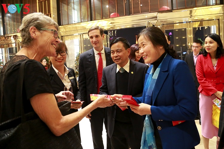 Lãnh đạo tỉnh Quảng Ninh chúc tết và mừng tuổi cho du khách quốc tế. Trường Giang/VOV |