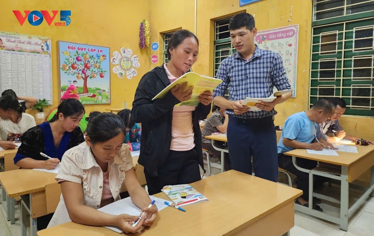 Dù cả ngày đi làm việc vất vả, nhưng đúng 19h, người dân ở bản Cà Là Pá đều có mặt tại lớp học đúng giờ. Ảnh: Vũ Lợi/VOV |