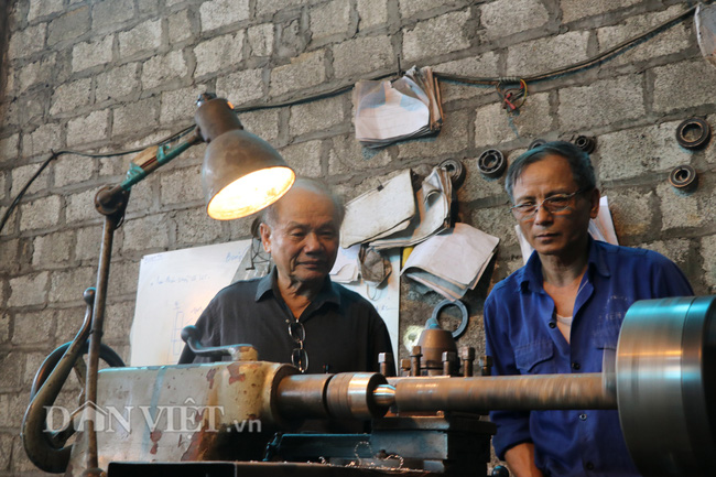 Ông Vũ Hữu Lê (bên trái) kiểm tra quá trình sản xuất máy nông cụ. Ảnh danviet.vn |
