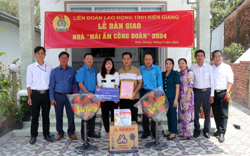 Công đoàn ngành Giáo dục Kiên Giang trao biển “Mái ấm Công đoàn” cho đoàn viên. Ảnh: Lê Huy Hải/TTXVN |
