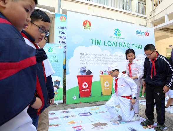 Học sinh trường tiểu học Phương Liệt hăng hái tham gia trò chơi tìm rác thải nhựa.