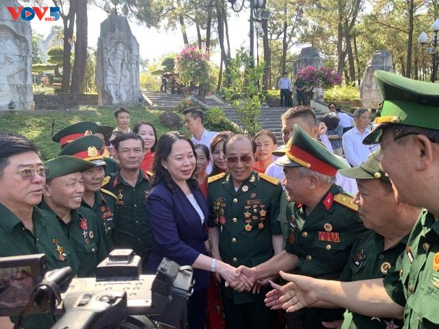 Phó Chủ tịch nước Võ Thị Ánh Xuân thăm hỏi các cựu chiến binh tại Nghĩa trang liệt sĩ Quốc gia Trường Sơn. Ảnh: Lê Hiếu/VOV |