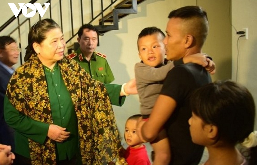 Phó Chủ tịch Thường trực Quốc hội Tòng Thị Phóng thăm và tặng quà bà con vùng lũ. - Ảnh: VOV |