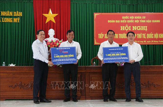 Nhân chuyến công tác tại tỉnh Hậu Giang, sáng 26/9, Phó Chủ tịch Thường trực Quốc hội Trần Thanh Mẫn và Đoàn đại biểu Quốc hội tỉnh Hậu Giang, đại diện Ủy ban Trung ương Mặt trận Tổ quốc Việt Nam, Tổng Liên đoàn Lao động Việt Nam trao 4,8 tỷ đồng kinh phí hỗ trợ các địa phương.