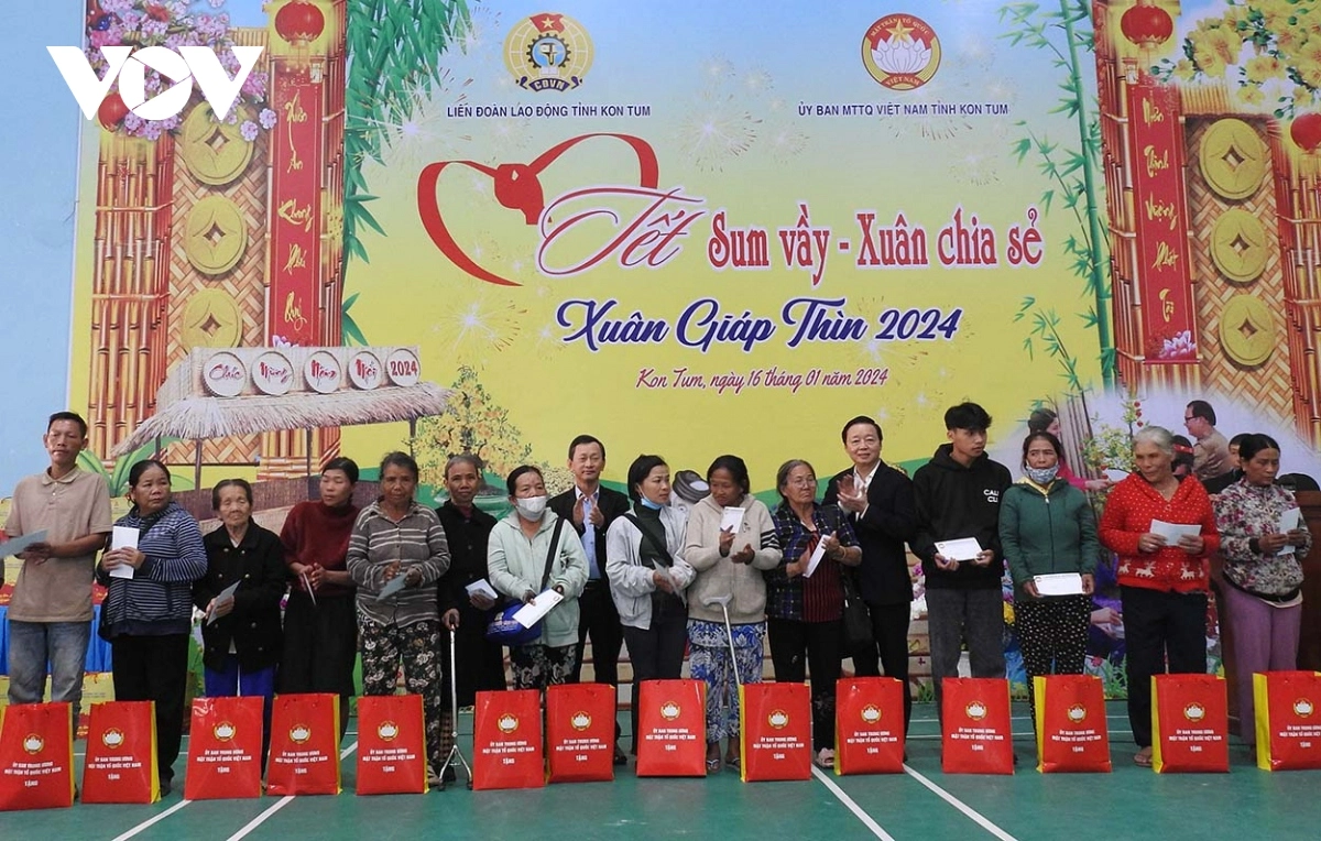 Phó Thủ tướng Chính phủ Trần Hồng Hà cùng ông Dương Văn Trang, Bí thư Tỉnh ủy, Chủ tịch HĐND tỉnh Kon Tum tặng quà Tết cho hộ nghèo. Ảnh: VOV |