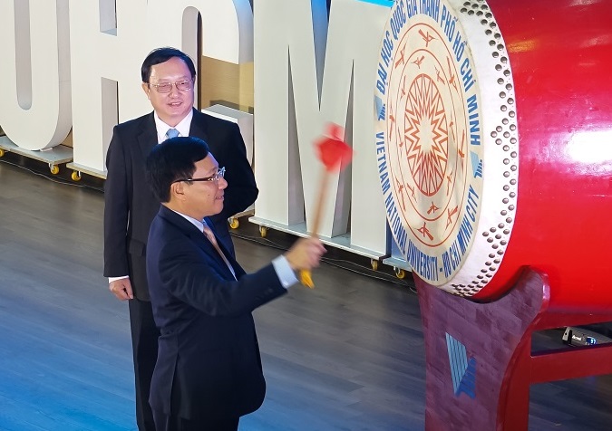 Phó Thủ tướng Phạm Bình Minh thực hiện nghi thức đánh trống khai khóa. - Ảnh: ĐHQG TPHCM |
