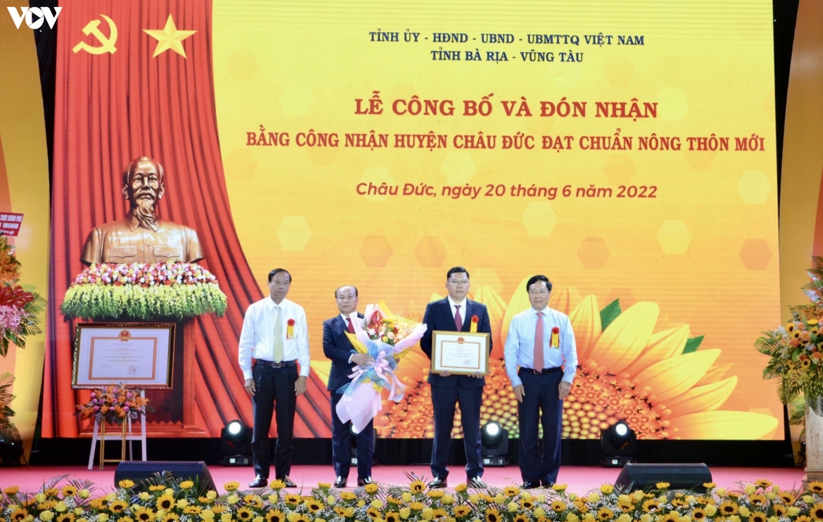 Phó thủ tướng chính phủ Phạm Bình Minh trao quyết định công nhận Nông thôn mới cho huyện Châu Đức - Ảnh: Thái Bình/ VOV |