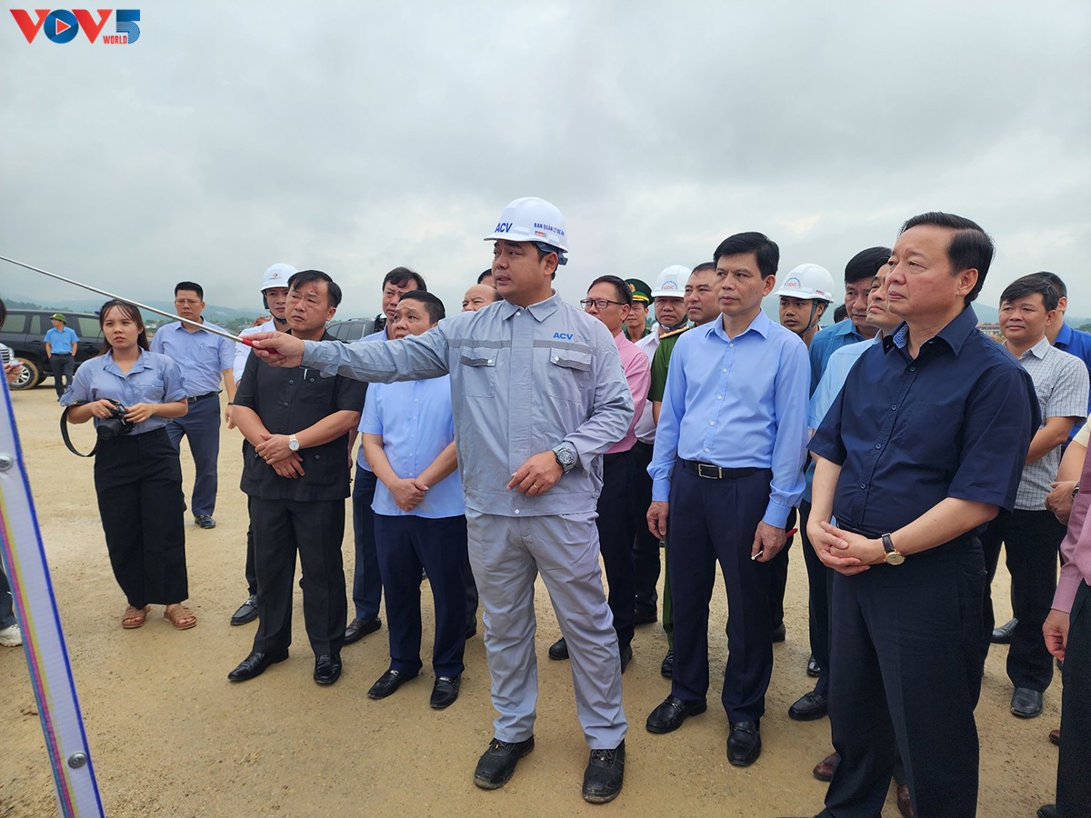 Phó Thủ tướng Trần Hồng Hà cùng đoàn công tác tiến hành kiểm tra tiến độ thi công dự án Sân bay Điện Biên (tỉnh Điện Biên) - Ảnh: Vũ Lợi/VOV |