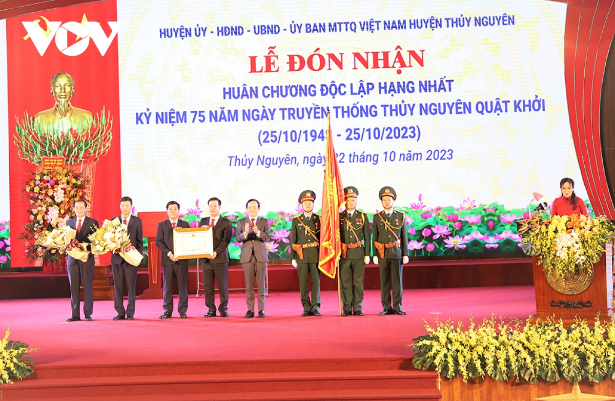 Sáng nay (22/10), Huyện Thủy Nguyên (TP Hải Phòng) tổ chức Lễ đón nhận Huân chương Độc lập hạng Nhất và Kỷ niệm 75 năm ngày truyền thống Thủy Nguyên quật khởi (25/10/1948 – 25/10/2023). Phó Thủ tướng Chính phủ Trần Lưu Quang dự và trao Huân chương Độc lập hạng Nhất cho Đảng bộ, chính quyền và nhân dân huyện Thủy Nguyên.