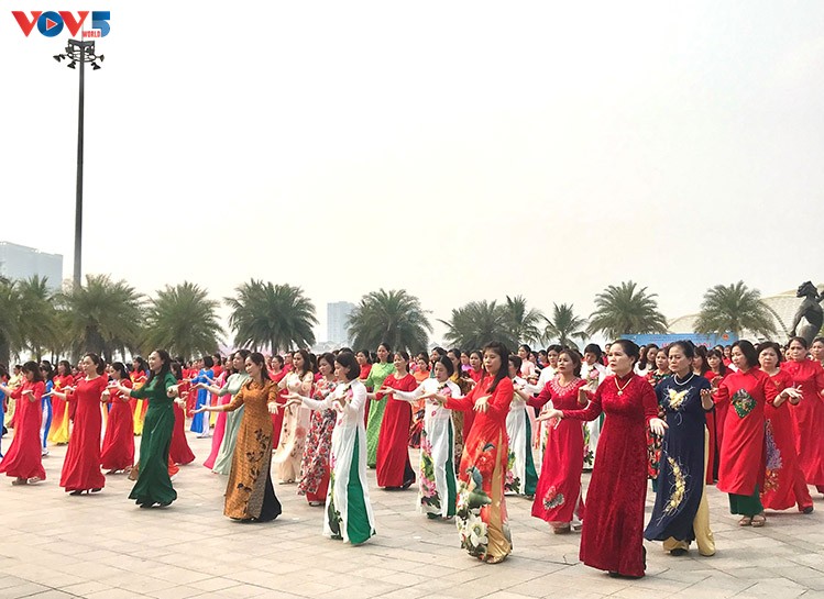 Hội viên Hội Liên hiệp Phụ nữ thành phố Đà Nẵng đồng diễn dân vũ thể thao trong trang phục áo dài truyền thống - Ảnh: VOV |