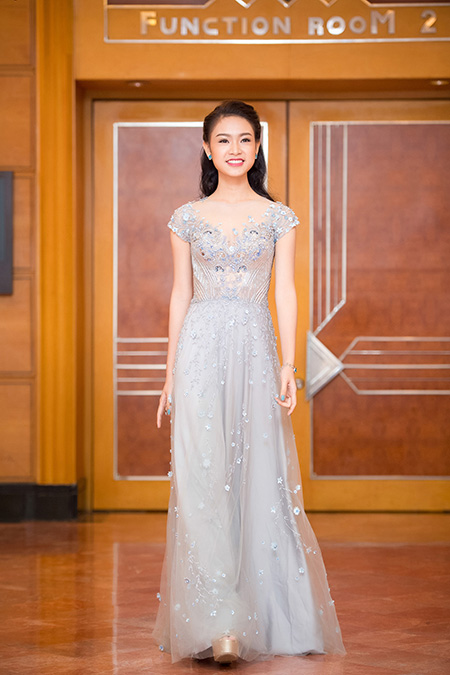 Xuất hiện tại buổi họp báo, Ngọc Vân lựa chọn cho mình bộ váy dạ hội màu xanh pastel vô cùng dịu dàng nhưng cũng không kém phần quyến rũ của nhà thiết kế Hoàng Hải