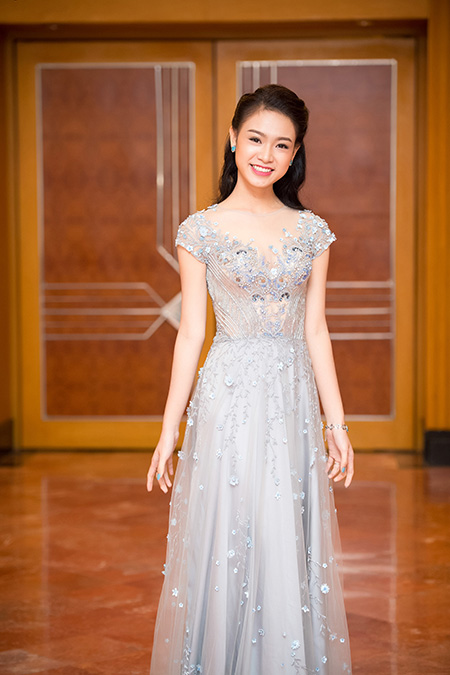 Bộ váy với dáng xuông được đính hoa dọc thân váy, phần thân trên lại được đính kết cườm tỉ mỉ trên nền vải xuyên thấu, mang lại vẻ đẹp lộng lẫy và xinh đẹp cho người đẹp có thành tích học tập cao nhất cuộc thi Hoa hậu Việt Nam 2016 với giải vàng khoa học quốc tế.