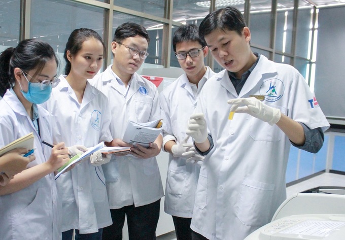 TS Nguyễn Hoàng Chinh hướng dẫn sinh viên nghiên cứu tách chiết hợp chất tự nhiên - Ảnh: NVCC |