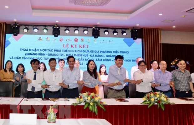 Ký kết Thỏa thuận hợp tác, phát triển du lịch giai đoạn 2022-2026 giữa 5 tỉnh miền Trung và khu vực Tây Nguyên. Ảnh: Hoài Thu/TTXVN |
